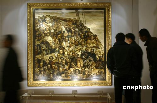 十一月四日,在嘉德2007秋季拍賣會預(yù)展上,觀眾正在觀摩中國畫家程叢林的油畫《華工船》。該作品以十九世紀(jì)華工背井離鄉(xiāng)、漂洋過海的血淚史為題材,是程叢林的代表作之一。該作品將于11月6日被拍賣,該作品估價超過2000萬元人民幣。中新社發(fā) 張煒 攝