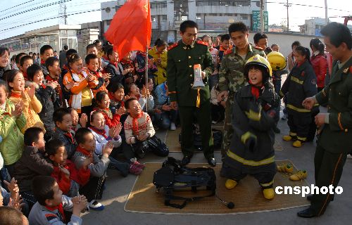 11月5日,小學(xué)生在消防戰(zhàn)士的幫助下試穿消防服,零距離接觸消防裝備。當(dāng)日,山東省棗莊市臺(tái)兒莊區(qū)消防大隊(duì)舉辦“消防開放日”活動(dòng),1000余名中小學(xué)生走進(jìn)消防大隊(duì)與消防裝備零距離接觸,消防隊(duì)員還將對(duì)中小學(xué)生進(jìn)行消防演示、講解消防法規(guī)、消防常識(shí)及火災(zāi)撲救方法等消防安全知識(shí)。中新社發(fā) 高啟民 攝