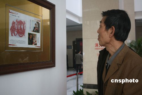 2007年2月17日,農(nóng)歷年三十,胡錦濤總書記到甘肅定西市安定區(qū)大坪村看望慰問當?shù)馗刹咳罕。在村民李彩家里,總書記問年景、看水窖、察糧倉,同主人親切拉家常。當總書記看到女主人在剪窗花時,也興致勃勃地拿起剪刀,剪起窗花?倳浐芸旒艉靡环l(xiāng)土氣息濃郁的《回娘家》窗花?倳浀恼淦芳炎鞅焕畈始艺洳亍5弥鞍怂嚬(jié)”在武漢舉行,經(jīng)李彩家人同意,中國剪紙學會會員、定西市剪紙協(xié)會副會長劉偉將李彩大兒子李宏偉珍藏的胡錦濤總書記剪紙《回娘家》,用特快專遞到武漢“第二屆國際剪紙藝術(shù)展”組委會。中新社發(fā) 李長林 攝
