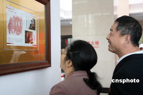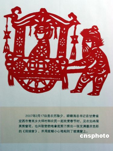 11月8日,觀眾正在欣賞胡錦濤總書記的剪紙作品《回娘家》。第二屆全國剪紙藝術展在武漢湖北藝術館展出,胡錦濤總書記的剪紙作品《回娘家》亮相藝術展。來自全國各地的觀眾一睹《回娘家》的風采,感受黨和國家領導人心系人民群眾,關心非物質文化遺產(chǎn)傳統(tǒng)藝術的濃濃情懷。中新社發(fā) 李長林 攝