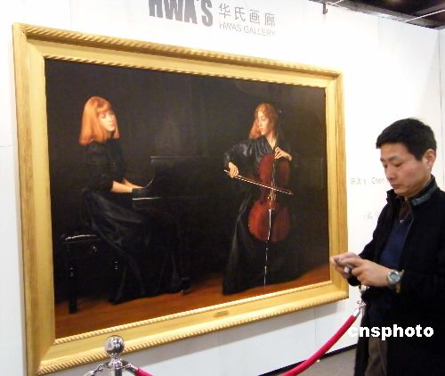 2007年11月15日,上海藝術(shù)博覽會(huì)在滬開(kāi)幕。華氏畫(huà)廊帶來(lái)的陳逸飛代表作《二重奏》,再度引起國(guó)內(nèi)外機(jī)構(gòu)的收藏興趣。這是陳逸飛所有音樂(lè)題材肖像畫(huà)中尺幅最大的作品,其擁有方表示,這幅畫(huà)只展覽,不出售。 中新社發(fā) 井韋 攝