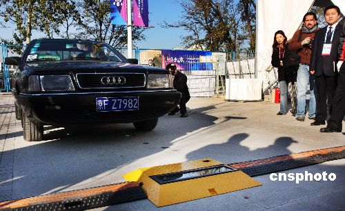 11月16日,北京奧運場館安保工作面向境內(nèi)外記者開放,一百余位記者在2008奧運柔道賽館——北京科技大學(xué)體育館體驗了快速車檢和人身安檢。北京奧運安保協(xié)調(diào)小組辦公室常務(wù)副主任、奧運安保指揮中心常務(wù)副總指揮劉紹武在現(xiàn)場介紹,一部X光機和兩部安檢門為一套系統(tǒng),在一小時內(nèi)可完成對八百名觀眾的安全檢驗,平均不到五秒鐘可放行一人。中新社發(fā) 鄭雄增 攝