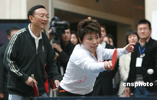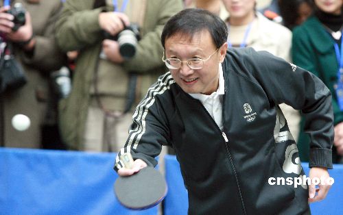 十一月二十五日,中國外交部在北京舉行主題為“中國外交與北京奧運(yùn)”的公眾開放日活動。圖為外交部長楊潔篪在“趣味乒乓賽”上一展身手。中新社發(fā) 廖文靜 攝