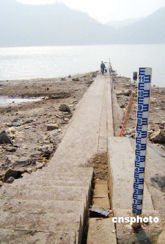 2007年12月7日,湖北宜昌江段裸露的江灘和水位標(biāo)尺。目前長江已進(jìn)入一年一度的枯水期,近期長江中游水位持續(xù)退落,比多年同期平均水位低近1.5米,根據(jù)當(dāng)前枯水形勢及水位水情特征,長江航務(wù)管理局決定,長江中游實(shí)施二級橙色預(yù)警。對通過中游的船舶吃水深度進(jìn)行規(guī)定,普通貨船實(shí)際吃水控制在2.4米及以下,危險品船舶實(shí)際吃水控制在2.3米及以下,下行船舶超過吃水限制的一律在宜昌港減載。中新社發(fā) 任衛(wèi)紅 攝
