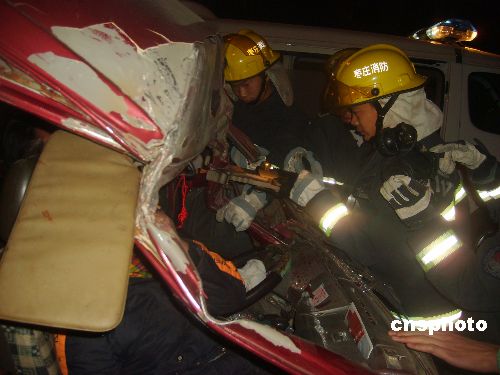 12月24日,山東棗莊發(fā)生一起兩車追尾事故。當?shù)叵乐ш犔厍谥嘘牻拥綀缶螅沙?2名消防官兵、一輛搶險救援車和一輛水罐車。經(jīng)過近半個小時施救,2名被困人員成功獲救。中新社發(fā) 季龍 攝