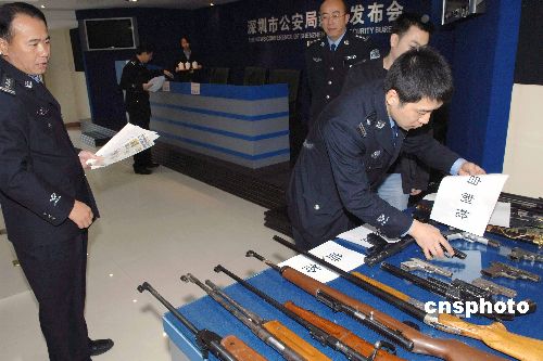 深圳警方一月三日對(duì)外發(fā)布消息,在近期開(kāi)展的治爆緝槍專(zhuān)項(xiàng)行動(dòng)中,再次收繳一批管制刀具、仿真槍支,破獲一批涉槍涉爆犯罪案件。中新社發(fā) 陳文 攝