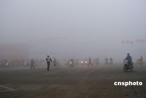 2008年1月7日,江蘇連云港遭遇大霧天氣,能見度不足50米,市民們謹(jǐn)慎出行!叭拧鼻跋,連云港最高溫度達(dá)到12℃,一直保持升高回暖的態(tài)勢,極易形成大霧天氣。中新社發(fā) 耿玉和 攝