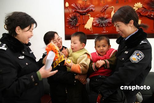 1月10日,沈陽市公安局社區(qū)警務(wù)支隊(duì)民警到市兒童福利院為無戶口的31名棄嬰解決戶口問題,并送去落戶手續(xù)。社區(qū)警務(wù)支隊(duì)的民警還為孩子們送去了精心選購的各種禮物。這些被遺棄的孤兒,多數(shù)無法查找到他們的身源,沒有戶口就如沒有一個(gè)合法的公民身份。為了不影響這些孩子今后的成長(zhǎng)、生活、學(xué)習(xí)、就業(yè)。沈陽市公安局社區(qū)警務(wù)支隊(duì)采取特事特辦的方式,解決棄嬰們的后顧之憂。到目前為止已為263名棄嬰辦理了落戶。中新社發(fā) 黃金昆 攝