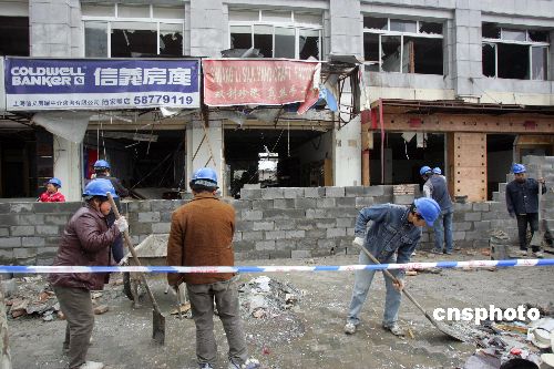 圖為工人在清掃爆炸事故現(xiàn)場(chǎng)。