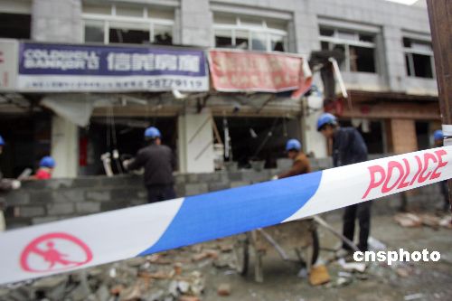 1月17日上午,上海金茂大廈附近一處二層的拆遷樓發(fā)生爆炸,現(xiàn)場(chǎng)有5名工人受傷沒有生命危險(xiǎn)。初步調(diào)查,事故原因可能是工人作業(yè)時(shí),拆遷工具碰到煤氣管道,引發(fā)爆炸。中新社發(fā) 湯彥俊 攝