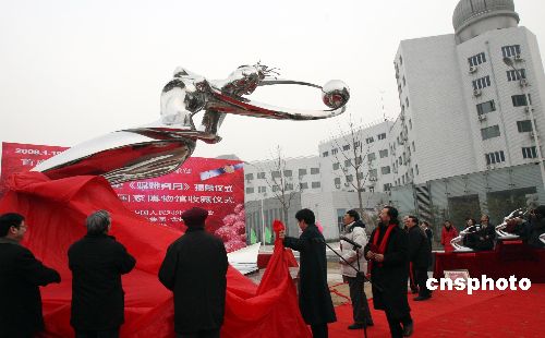 1月19日,中國科學(xué)院辦公廳、中國國家博物館、國家天文臺在北京中國科學(xué)院奧運(yùn)村科技園聯(lián)合舉行大型雕塑作品“嫦娥奔月”落成揭幕儀式,同時舉行該作品由中國國家博物館永久收藏儀式。雕塑“嫦娥奔月”由中國著名雕塑藝術(shù)家遙遠(yuǎn)先生創(chuàng)作完成,聯(lián)手四川舍得酒業(yè)集團(tuán)贈送中國科學(xué)院。中新社發(fā) 錢興強(qiáng) 攝