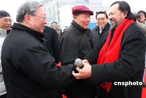 圖為全國人大副委員長、中國科學(xué)院院長路甬祥與雕塑藝術(shù)家遙遠(yuǎn)雕塑(右)先生握手表示祝賀。