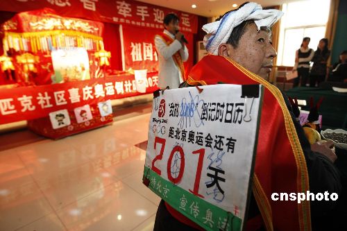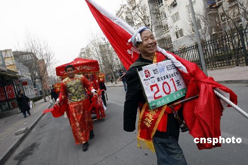 1月20日,山西“驢驢人”倪育生和來自山東的大花轎一起闖進了北京東四奧林匹克社區(qū),為迎接北京奧運會倒計時200天做宣傳。當日,來自全國7省市的民間奧運宣傳志愿者齊聚北京,相互交流奧運宣傳經驗。中新社發(fā) 杜洋 攝
