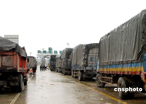 1月22日,在滬昆高速湖南邵陽懷化段洞口入口處,等待通行的車輛排起長龍。連日持續(xù)冰凍天氣,導(dǎo)致滬昆高速邵陽至懷化段的橋梁、涵洞全部冰凍,車輛無法通行,造成公路封閉。有關(guān)部門正采取措施,疏導(dǎo)滯留車輛。中新社發(fā) 滕治中 攝