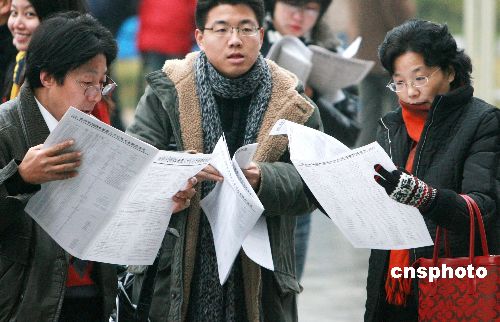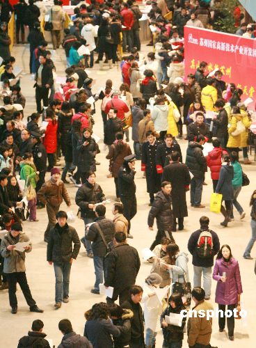1月26日,2008年蘇州春季人才交流大會(huì)暨畢業(yè)生雙選會(huì)開場(chǎng)。據(jù)了解,本次“雙選會(huì)”有近500家用人單位進(jìn)場(chǎng)招聘,為求職者提供12000多個(gè)職位。其中事業(yè)單位需求崗位1300余個(gè)、企業(yè)單位需求崗位10900多個(gè),博士、碩士生及本科以上學(xué)歷占需求總量的53%以上。據(jù)主辦方稱,當(dāng)日進(jìn)場(chǎng)人數(shù)可逾6萬(wàn)。中新社發(fā) 蘇秀 攝
