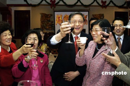 中國駐美大使周文重(中)及夫人謝淑敏女士(左一)和駐美使館領事部全體外交官1月26日來到華盛頓特區(qū)唐人街,向大華府地區(qū)各僑社領袖拜年。圖為周文重大使向僑領敬酒。中新社發(fā) 邱江波 攝
