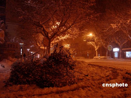 1月28日凌晨,江蘇南京漢中門大街路旁,部分樹枝不堪重負,被厚重的積雪壓斷。連日持續(xù)的暴雪襲擊江蘇,積雪已達20多厘米。據氣象部門發(fā)布,這是近10年來江蘇罕見的連續(xù)性大面積強雨雪天氣。中新社發(fā) 胡高華 攝