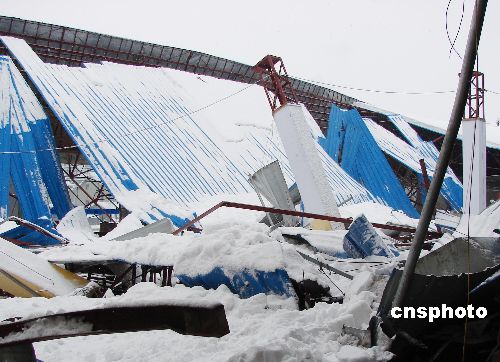 1月28日晨,連續(xù)多日的降雪,使江蘇儀征雪深達(dá)20多厘米,厚厚的積雪壓塌了儀征一家具城部分屋頂,幸末有人員傷亡。中新社發(fā) 黃建林 攝
