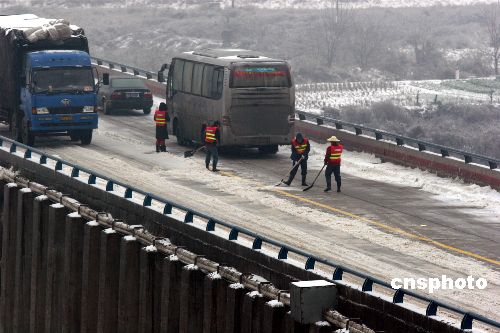 1月28日,工人們正在107國道湖南水渡河大橋上緊張除冰,車輛從他們身邊緩慢駛過。根據(jù)最新氣象資料分析,本周湖南將繼續(xù)維持雨雪、冰凍、嚴(yán)寒天氣,局部地區(qū)有大到暴雪。抗災(zāi)形勢依然十分嚴(yán)峻。中新社發(fā) 白祖偕 攝