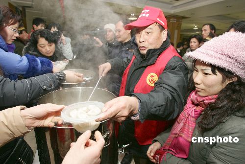 近期由于受大雪天氣影響導(dǎo)致國內(nèi)大范圍的鐵路、公路交通受阻或中斷,使大批返鄉(xiāng)旅客滯留杭州火車站、杭州火車東站和市區(qū)各大長途汽車站,從1月27日起,杭州市開辟了部分劇院、大廈、會(huì)展中心、體育館等公共場所及搭建軍用帳篷等作為滯留旅客的臨時(shí)駐留點(diǎn)。至1月30日下午,已先后接待了近10萬人次的滯留旅客,當(dāng)?shù)氐恼块T、企事業(yè)單位、部隊(duì)、公安、街道、衛(wèi)生、共青團(tuán)、市民志愿者等紛紛行動(dòng)起來,按照“有水喝、有飯吃、有地方安頓、生病有醫(yī)治、困難群眾有救助”的要求,以各種形式盡力為所有滯留旅客提供生活保障和溫馨服務(wù)。 中新社發(fā) 李忠 攝
