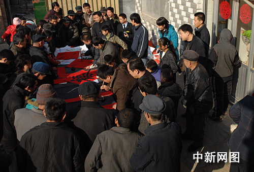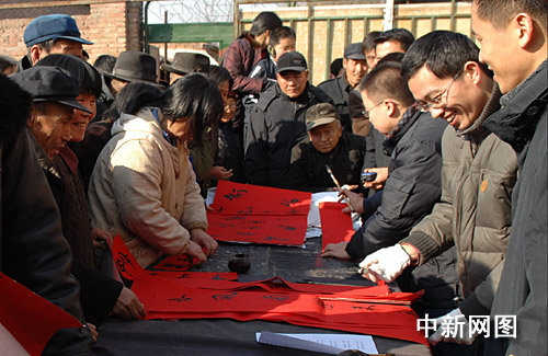 1月31日,河北滄州市部分書法家、企業(yè)家來到“感動中國支教模范”白芳禮的家鄉(xiāng)滄縣白賈村,為鄉(xiāng)親們書寫春聯。王少華 攝