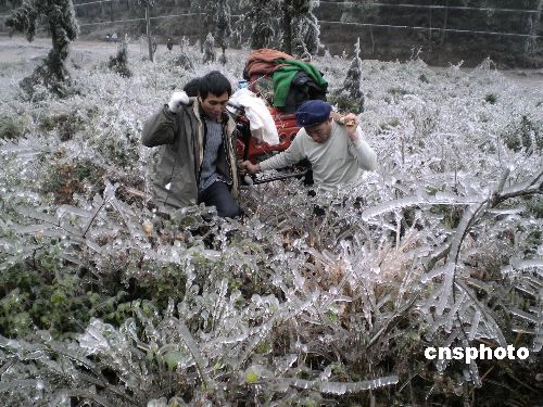 廣西最近遭遇嚴重雨雪冰凍災害,電力、通訊設施受到嚴重影響,圖為中國移動廣西公司搶修人員抬柴油機進入“冰”山搶修移動基站。中國移動廣西公司已啟動最高等級應急通信方案,全力保障通信網(wǎng)絡暢通,向重災區(qū)提供信息發(fā)布綠色通道和延遲停機等服務,為抗災救災提供通信保障。中新社發(fā) 申蓓 攝