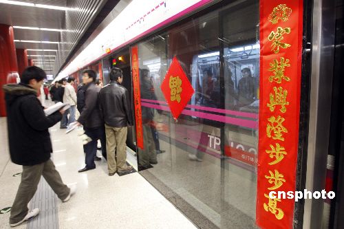圖:春聯(lián)貼進(jìn)北京地鐵 乘客坐車猶如過(guò)年