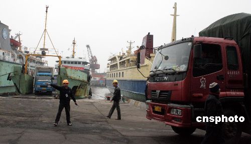 2月4日,?诟鄞a頭,出島和進島運輸冬季瓜菜在卡車接連不斷。長江中下游地區(qū)大量大棚蔬菜因雪災(zāi)凍死,位于熱帶的海南島成了名副其實的“中國菜籃子”。中國商務(wù)部、鐵道部、交通部三部委官員目前已聯(lián)合抵瓊,會商緊急調(diào)運海南冬季瓜菜,以保障雪災(zāi)災(zāi)區(qū)人民及港澳地區(qū)的蔬菜供應(yīng)。中新社發(fā) 關(guān)向東 攝