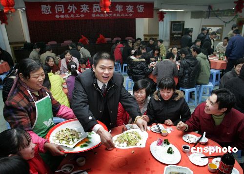 2月4日晚,在福州市福興投資區(qū)務(wù)工的老陳喜洋洋地在食堂端上熱騰騰的美食,和工友一起提前吃上了一頓豐盛的年夜飯。老家湖南的他今年因暴雪無法回家過年,據(jù)了解,福州僅晉安區(qū)像老陳這樣的滯留外來工有5000多人,當(dāng)?shù)卣凸M織近期陸續(xù)為區(qū)內(nèi)滯留外來工準(zhǔn)備了600余桌的年夜飯,讓不能回家的農(nóng)民工兄弟感受到在福州過年的溫暖。中新社發(fā) 包華 攝