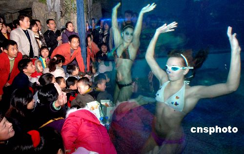 2月8日正月初二,來自俄羅斯遠東奧林匹克中心水下芭蕾表演隊的俄羅斯姑娘在福州一海底世界表演精彩水下芭蕾,令前來觀看的福州觀眾陶醉。中新社發(fā) 劉可耕 攝