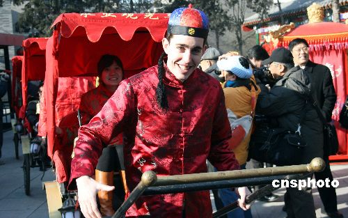 2月8日,農(nóng)歷正月初二,是天津女婿給岳父母大人拜年的特定日子,天津人稱之為“姑爺節(jié)”。圖為“洋”姑爺在天津古文化街新春廟會(huì)上參加姑爺節(jié)活動(dòng)。中新社發(fā) 吳迪 攝