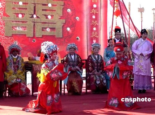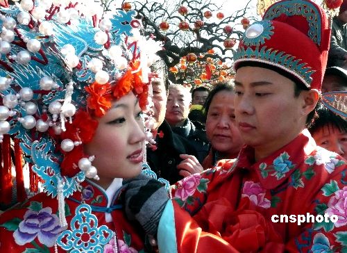 2月8日,由北京大觀園主辦的2008年紅樓廟會吸引眾多游客,在廟會傳統(tǒng)的“元妃省親”古裝游行的盛大場景中,大觀園為《紅樓夢》一書中未能成婚的賈寶玉、林黛玉專門舉行一場別開生面的“寶黛成婚”場面,令游客耳目一新。中新社發(fā) 錢興強 攝