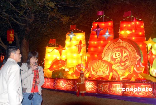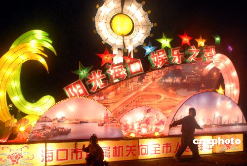 2008年2月7日晚,游人在“現(xiàn)代都市”燈前休閑觀賞。農(nóng)歷大年初一,眾多市民和游客到海口萬綠園觀賞“華燈璀璨耀椰城”大型燈展。中新社發(fā) 善平 攝