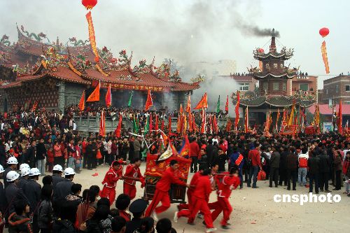 2月10日中午,廈門市同安區(qū)西柯鎮(zhèn)呂厝村四年一次民間民俗盛事--迎“王船”活動吸引了眾多的群眾。當(dāng)?shù)孛癖娦欧畹倪@個王爺叫“代天巡狩”。傳說“代天巡狩”神威顯赫,總能替天行道,愛護(hù)百姓,當(dāng)?shù)孛癖姸己芫囱鏊。因而,到了新舊王爺?shù)慕唤幽,?dāng)?shù)厝罕姸紩e行“送王”和“迎王”慶典,表達(dá)他們祈平安慶豐收的心情。通常,申子辰年(鼠、龍、猴年)為新舊王爺交接年,交接年間的正月初四為迎接新任王爺?shù)氖,同年的農(nóng)歷十月?lián)袢諝g送原任王爺,形成了四年一任的民間迎送王爺?shù)氖。中新社發(fā) 吉辛 攝