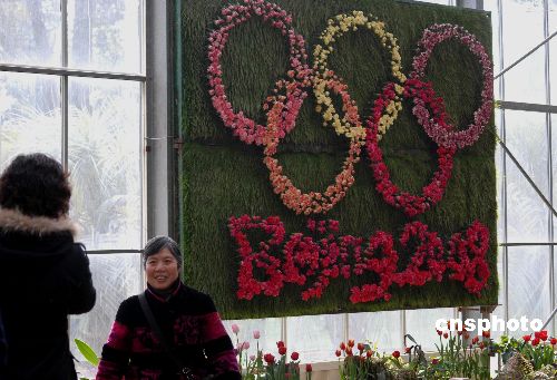 2008年2月14日,湖北武漢市植物園用數(shù)千朵康乃馨組成的北京2008奧運(yùn)會(huì)五環(huán)圖案和各種栩栩如生的體育比賽項(xiàng)目圖案,吸引了前來(lái)賞花游園的市民。中新社發(fā) 楚天行 攝