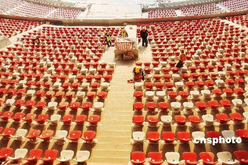 2月18日,工人們正在國(guó)家體育場(chǎng)“鳥巢”內(nèi)清潔座椅。北京2008年奧運(yùn)會(huì)主會(huì)場(chǎng)——國(guó)家體育場(chǎng)“鳥巢”8萬個(gè)固定座椅已于1月底安裝完工,這意味著北京國(guó)家體育場(chǎng)“鳥巢”的建設(shè)工程已接近尾聲。中新社發(fā) 鄭雄增 攝