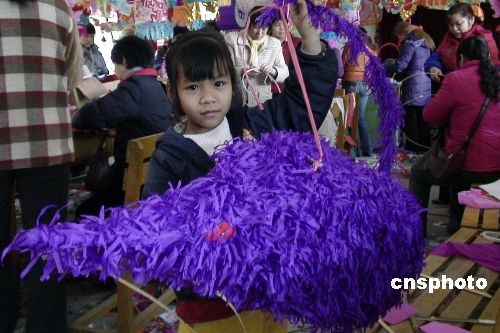 二月二十日,廣西南寧市菠蘿嶺社區(qū)居民忙著扎制花燈,一女孩展示扎制好的鼠形花燈。過元宵賞花燈是當?shù)亓?xí)俗。中新社發(fā) 王剛 攝