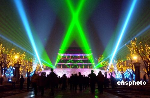 2月20日,北京永定門城樓開始為元宵燈會試燈,電腦激光燈在城樓上印出奧運五環(huán)、“同一個世界 同一個夢想”、元宵節(jié)快樂等圖案和字樣。元宵節(jié)當晚永定門城樓將上演一場絢麗的激光秀。中新社發(fā) 廖攀 攝
