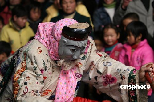 2月20日,江西宜春萬(wàn)載潭埠鎮(zhèn)池溪村村民跳起儺舞鬧元宵,村文化中心人聲鼎沸,鑼鼓喧天,香煙裊裊,爆竹聲聲。人們以?shī)蕵?lè)形式向儺神祈求國(guó)泰民安、人壽年豐。正月跳儺的風(fēng)俗在萬(wàn)載源遠(yuǎn)流長(zhǎng)。萬(wàn)載儺舞,始于元末明初,似深山璞玉,如峽谷幽蘭,習(xí)俗盛行,古樸祥和,儀態(tài)萬(wàn)千,被譽(yù)為“中國(guó)古代舞蹈活化石”,跳儺者頭戴面具,身著古裝,手執(zhí)各種兵器,在民間打擊樂(lè)的伴奏下,手舞足蹈,其表現(xiàn)手法嚴(yán)肅而詼諧。中新社發(fā) 彭小榕 攝