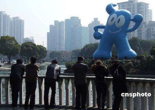 上海世博會吉祥物“海寶”現(xiàn)身新天地以來,吸引了許多中外游客。2月28日,聳立在太平湖面上的大個子海寶,成為城市一景。中新社發(fā) 蔣振雄
