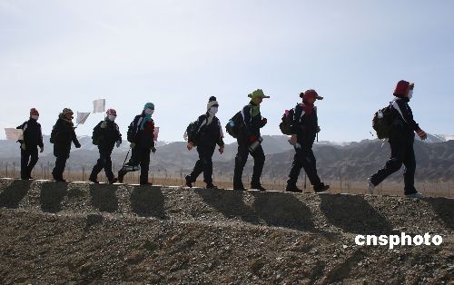 2月28日,新疆哈密伊吾縣八名農(nóng)牧民婦女從302省道50公里處走過。2月27日,新疆哈密伊吾縣八名農(nóng)牧民婦女為慶三八、迎接奧運(yùn)自發(fā)組織徒步行走208公里,此次活動(dòng)將用八天時(shí)間走完全程。她們的行動(dòng)受到了沿途農(nóng)牧民的支持和好評(píng)。中新社發(fā) 普拉提 攝