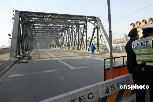 3月1日零時(shí),上海外白渡橋準(zhǔn)時(shí)封閉交通,它的整修工程也將隨之展開,擇日整體移入工廠進(jìn)行大修。中新社發(fā) 湯彥俊 攝