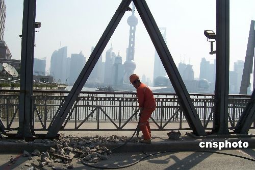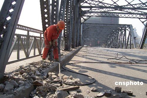 3月3日,上海外白渡橋移橋前期施工正在展開。施工人員在去除橋面混凝土層,外白渡橋在拆下一些零部件后,將被整體吊裝,分兩部分用駁船移至船廠大修。中新社發(fā) 周東潮 攝