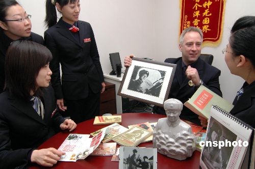 3月5日,“洋雷鋒”羅杰斯在“外國(guó)人學(xué)雷鋒我們?cè)趺崔k?”活動(dòng)中展示自己收藏品。遼寧省錦州市商業(yè)銀行凌云支行外籍員工、美國(guó)人羅杰斯不但崇拜雷鋒,而且對(duì)學(xué)雷鋒情有獨(dú)鐘,收藏?cái)?shù)百件有關(guān)雷鋒的物品,而且翻譯了雷鋒日記。他在工作、生活中堅(jiān)持用雷鋒精神要求自已,做了很多有意義的事,為弘揚(yáng)傳承雷鋒精神寫了大量文章,羅杰斯說雷鋒精神是一種超越國(guó)界、超越時(shí)空、超越意識(shí)形態(tài)的精神。中新社發(fā) 李鐵成 攝