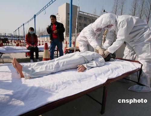 3月5日,安徽蒙城縣舉行人禽流感防治應(yīng)急處置演練,從縣衛(wèi)生醫(yī)療機(jī)構(gòu)抽調(diào)的有關(guān)人員分別參加了人員防護(hù)著裝與卸裝、病人就診、疫情報告、醫(yī)療救治、院內(nèi)疫情流調(diào)防控及病人救治、病人居住地疫情防控、應(yīng)急處置等七個部分的實地演練。據(jù)悉,演練旨在檢驗人禽流感防治預(yù)案的可操作性和執(zhí)行效果,測試醫(yī)療衛(wèi)生機(jī)構(gòu)衛(wèi)生應(yīng)急及醫(yī)療救助能力,提高全縣應(yīng)對突發(fā)公共衛(wèi)生事件應(yīng)急處置能力。中新社發(fā) 胡衛(wèi)國 攝