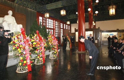 中共中央統(tǒng)戰(zhàn)部副部長(zhǎng)樓志豪向?qū)O中山像敬獻(xiàn)花籃。