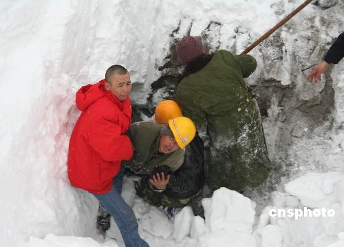 3月13日上午11點(diǎn)20分左右,位于新疆天山果子溝的西氣東輸二線工程一處隧道施工現(xiàn)場發(fā)生雪崩,目前已知有6名被困在隧道內(nèi)的工人獲救。由于隧道口被大雪掩埋,被困人數(shù)不詳,搜救工作仍在持續(xù)中。圖為現(xiàn)場救援人員救出一名被困工人。中新社發(fā) 馬耀林 攝