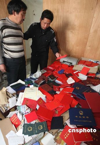 3月19日,河南洛陽(yáng)警方在一民宅內(nèi)將一伙制造假證的犯罪集團(tuán)逮個(gè)正著。行動(dòng)中查獲各類假證7大類145種共計(jì)10000多份,現(xiàn)場(chǎng)還查獲印章、鋼印、電腦、打印機(jī)等一批制假造假設(shè)備。在事實(shí)面前,犯罪嫌疑人對(duì)犯罪事實(shí)供認(rèn)不諱。中新社發(fā) 曾憲平 攝