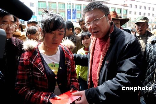 3月22日,拉薩一服裝店門前,中國新聞社西藏分社社長柳俊武向受害者卓嘎捐助善款。在拉薩3月14日發(fā)生的打砸搶燒破壞活動中,該服裝店的五名女員工被活活燒死在店中,卓嘎是當(dāng)時的幸存者。中新社發(fā) 廖攀 攝