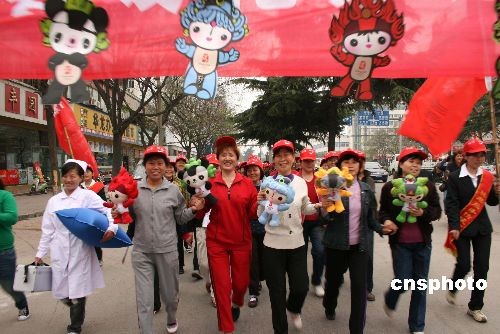 4月7日,河南南陽市臥龍區(qū)60多位社區(qū)大媽以慢跑形式,迎接北京奧運(yùn)會。本次名為“春暖花開迎奧運(yùn)”的慢跑活動,總路程為五公里,大媽們以飽滿的精神、驕健的步伐充分釋放喜迎奧運(yùn)的激動心情。中新社發(fā) 付海厚 攝